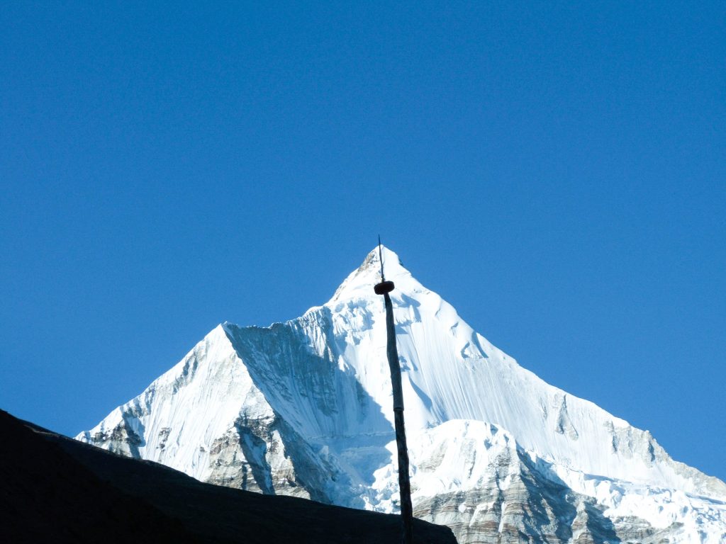 Other than a short 45 minute climb at the beginning, the day’s trek is downhill all the way. The trail follows a ridge affording great views of the valleys on either side and a wonderful view of Jho Drakey. A steep descent of 2-3 hours then follows.